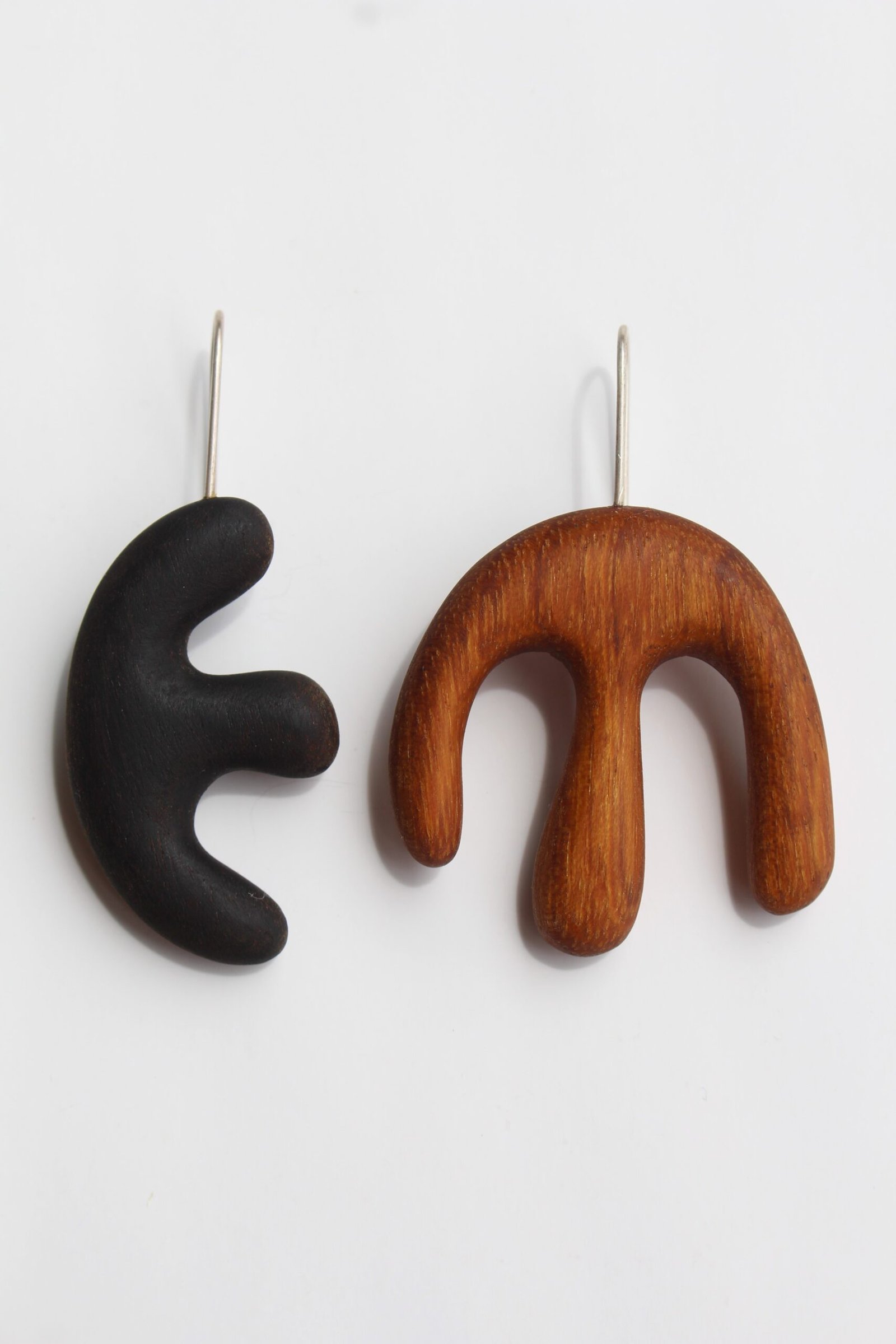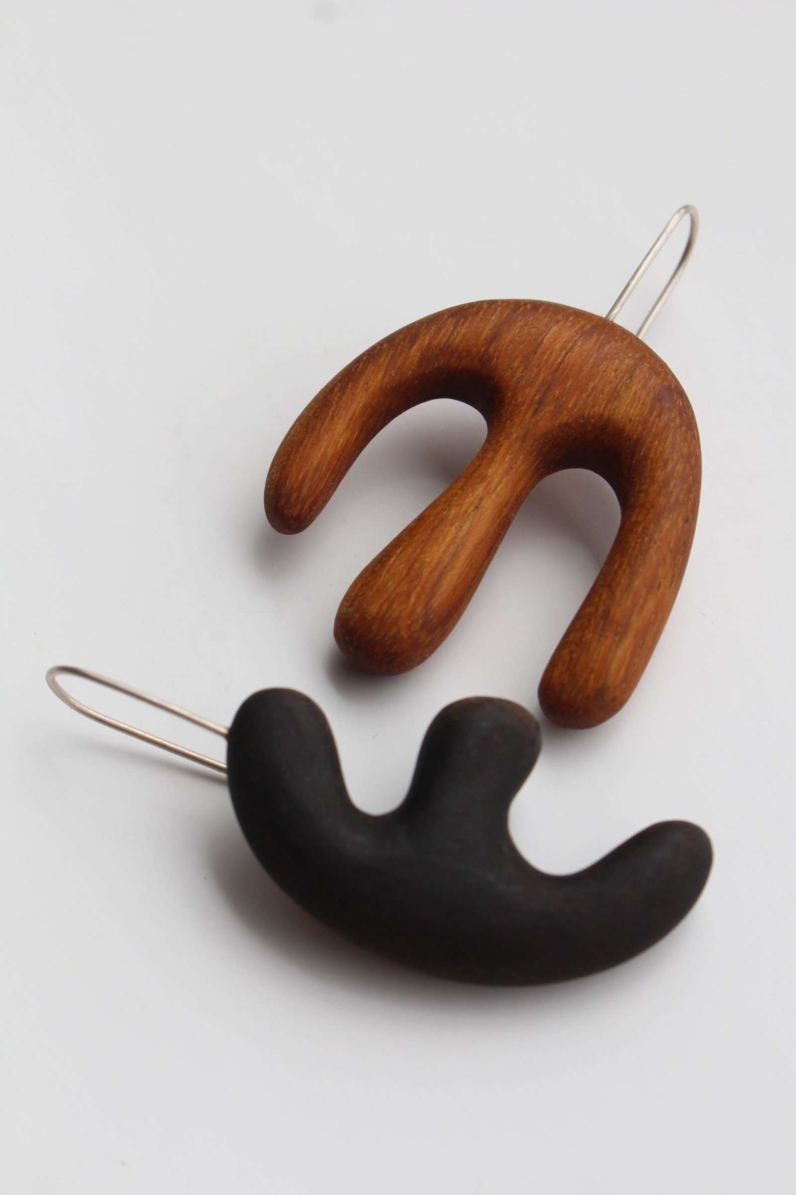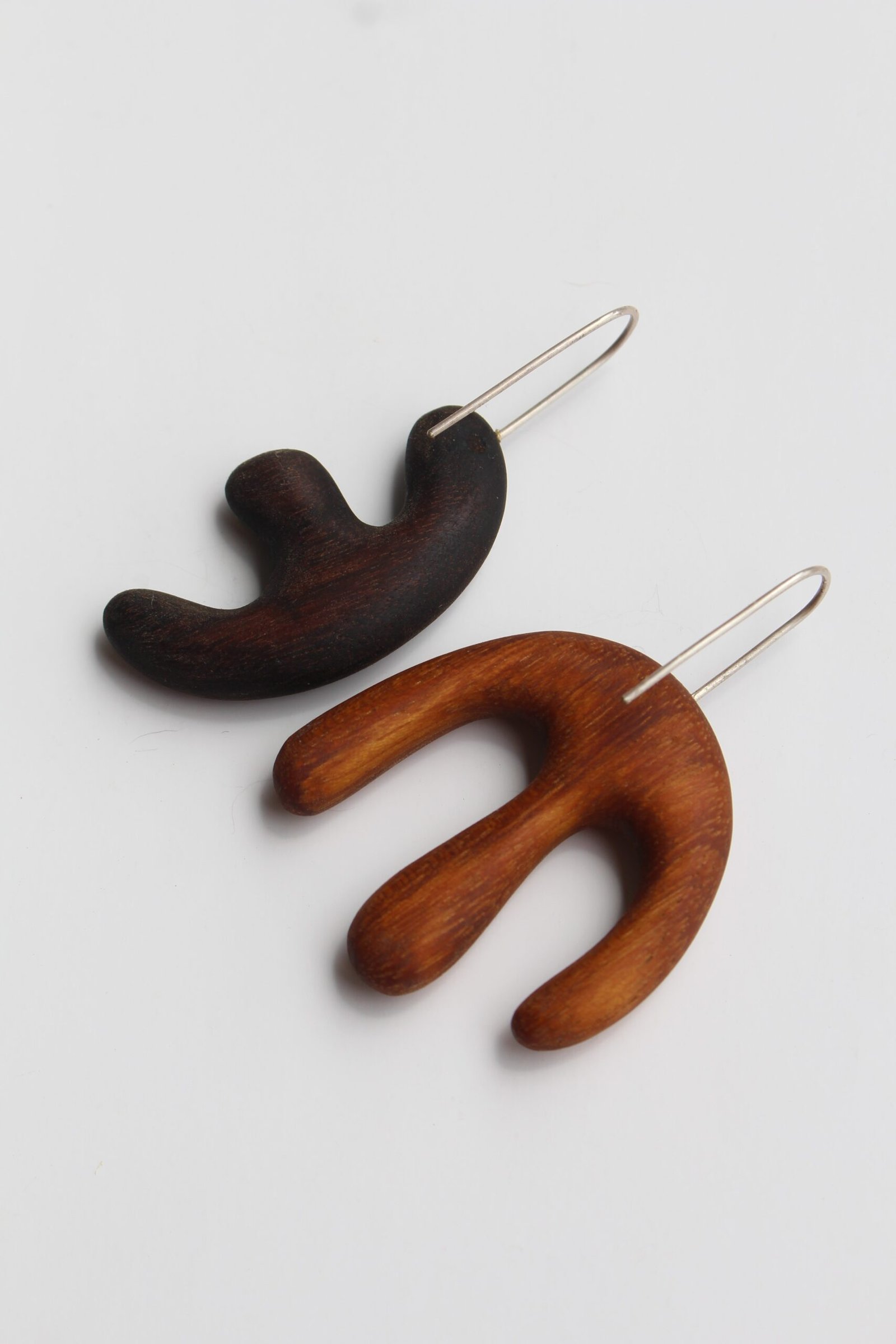 Brinco produzido artesanalmente com madeira de reaproveitamento e prata.